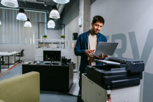 Man using a laptop while standing next to a printer in a modern office setting during daytime